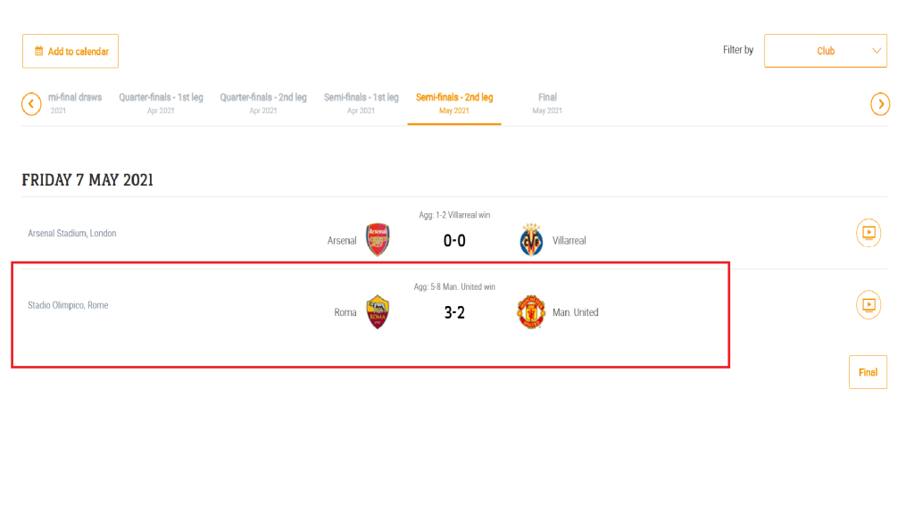Onwards to Semi Finals where they were knocked out the last time they were here. In Semi-Finals, they met the Italian Side Roma for a 2 Leg Match and won by aggregate 5-8 (6-2 Home / 3-2 Away) and thus have reached the Finals of the UEFA Europa League.